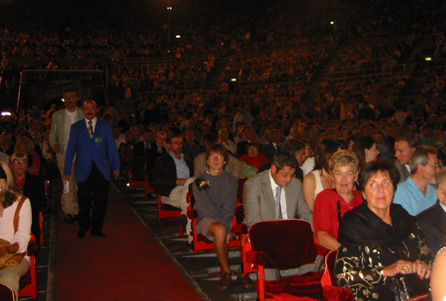 Lady Muck, in amongst the 'jewellery' First up was Tosca. Terrific seats, four rows back, red carpet, red velour seats! Fantastic! The scenery caused a few 'tut tut's as it comprised of a giant Roman head and a giant Roman arm holding a giant Roman sword. Looked good to me but it didn't go down well with the traditionalists. Anyway, we enjoyed a marvelous production. The following night we saw Madame Butterfly. More traditional scenery, so that kept people happy. Madame Butterfly is not one of my favourites. It's the story of a dumb 15 year old who get ups the duff by an American sailor who leaves Japan and she expects him to come back to her! When the penny drops, she tops herself. But hey, that's entertainment! We enjoyed it and that's all that matters. I would have put in a couple of pictures of the inside of Arena but they are just not good enough. Take my word for it, it's very impressive! Would we go again? Money no object, like a shot. One of the most enjoyable experiences of our lives. A tremendous week. Venice You couldn't go to Verona/Vincenza without at least making a day trip to Venice could you? So that's what we did. The precedent had been set by the top seats at the opera so we had to carry on by taking 1st class seats on the Eurostar to Venice. Way to go! We were told, in no uncertain terms, NOT to have a coffee in St Marks Square. We took notice of that didn't we? (Tim, don't be so childish!) Three coffees and a diet Coke in Florians and the bill came to a piffling €38.50. But being used to 1st class, we didn't flinch. That's it until the next exciting installment. ------={}=------ |